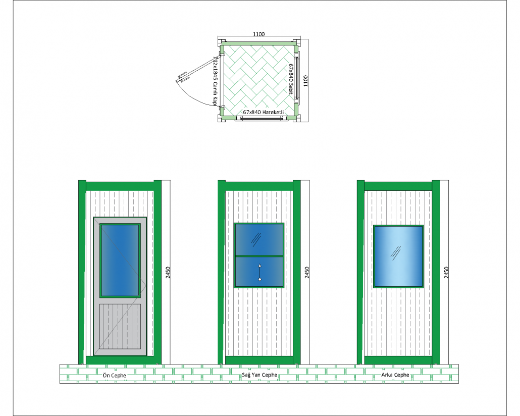 Bu panel kabin, kompakt ve dayanıklı tasarımıyla dar alanlarda kullanım için ideal bir çözümdür. 1100 mm x 1100 mm taban ölçülerine ve 2540 mm yüksekliğe sahip olan bu kabin, minimal alanlarda maksimum işlevsellik sunar. Kabinin ön cephesinde bulunan camlı kapı (924×1954 mm), iç mekana kolay erişim sağlar ve ferah bir giriş sunar. Sağ yan cephede yer alan hareketli pencere (676×840 mm), içeriye hava akışı sağlamak ve kabin içinde havalandırmayı artırmak için tasarlanmıştır. Arka cephede ise sabit bir pencere mevcuttur; bu pencere, doğal ışığın içeri girmesini sağlar ve enerji tasarrufuna katkıda bulunur.