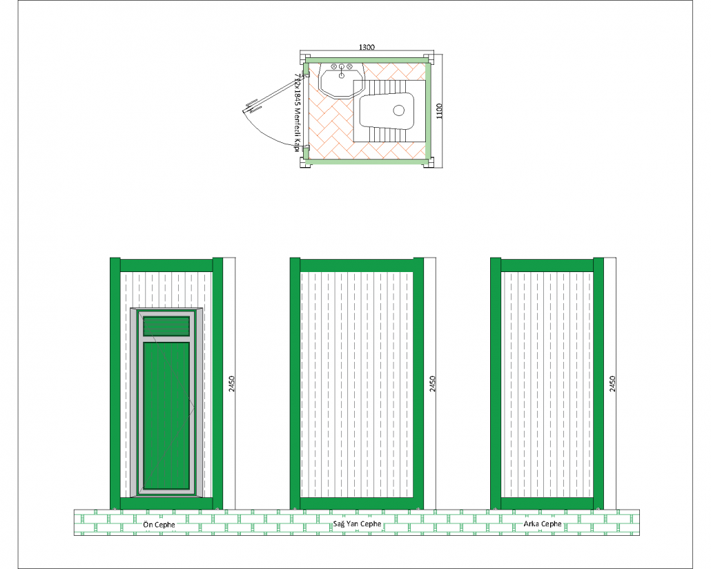 Ön cephede camlı kapı, üst kısmında havalandırmayı destekleyen küçük bir pencere ile tasarlanmıştır. Sağ yan ve arka cepheler kapalı bırakılarak mahremiyet sağlanmıştır. Hafif çelik çerçeve ve dayanıklı panel malzemeler kullanılarak üretilen kabin, dış etkenlere karşı dayanıklılık sunarken, iç mekanda konforu artıracak yalıtım özelliklerine sahiptir.