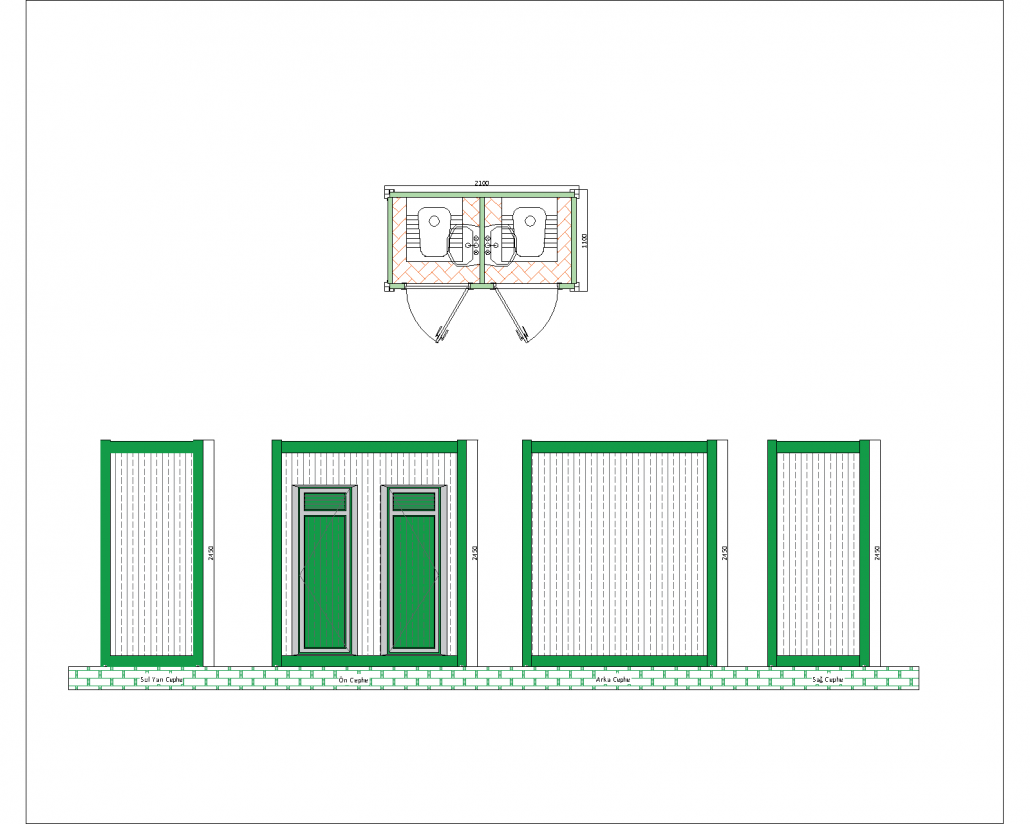 Bu panel kabin, iki ayrı tuvalet ünitesine sahip olup, ortak kullanıma yönelik tasarlanmış pratik ve dayanıklı bir prefabrik yapı çözümüdür. 2100 mm x 1100 mm taban ölçülerine ve 2540 mm yüksekliğe sahip olan bu kabin, özellikle şantiyeler, açık hava etkinlikleri ve geçici tesisler için ideal bir seçenektir. Kabin, iki ayrı girişe sahip olup her girişte camlı kapılar bulunmaktadır. Bu kapılar, üst kısımlarında havalandırmayı destekleyen küçük pencerelerle donatılmıştır.