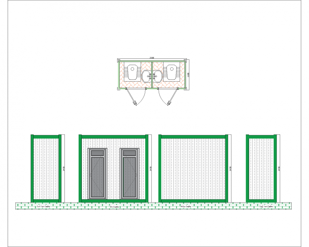 Bu panel kabin, geniş iç yapısı ve çift tuvalet bölümü ile özellikle yoğun kullanıma uygun, pratik ve dayanıklı bir çözüm sunmaktadır. 2500 mm x 1100 mm taban ölçülerine ve 2540 mm yüksekliğe sahip olan kabin, iki ayrı girişli yapısı ile kullanıcıların mahremiyetini ve konforunu ön planda tutar. Her iki girişte de camlı kapılar bulunmakta olup, üst kısımlarında küçük pencereler ile havalandırma sağlanmaktadır.