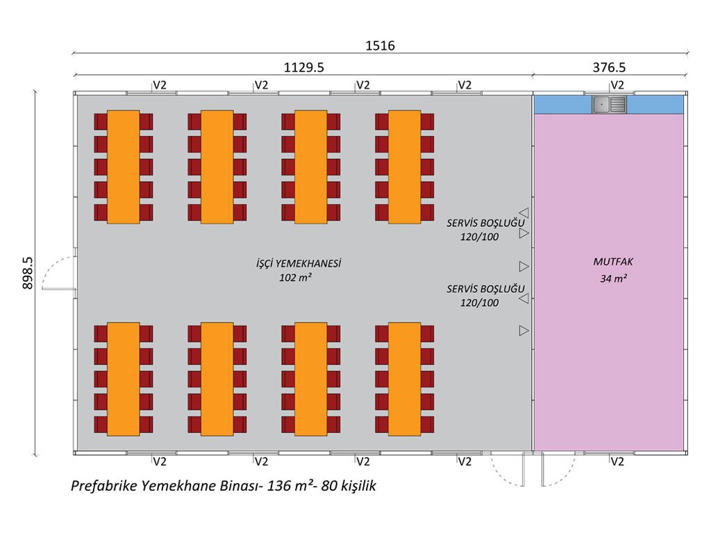 Bu prefabrik yemekhane binası, 136 m² alanı ve 80 kişilik kapasitesiyle geniş yemek alanı ihtiyacını karşılayacak şekilde tasarlanmıştır. Yemekhanenin 102 m²’lik bölümü, düzenli oturma alanı ile konforlu bir yemek deneyimi sunar. Her biri rahat erişim sağlayan masa düzeni, işçilerin yemek saatlerinde ferah bir ortamda bulunmalarını sağlar. Ayrıca, yemek servisinin kolay yapılabilmesi için 120/100 cm genişliğinde iki servis boşluğu bulunmaktadır.